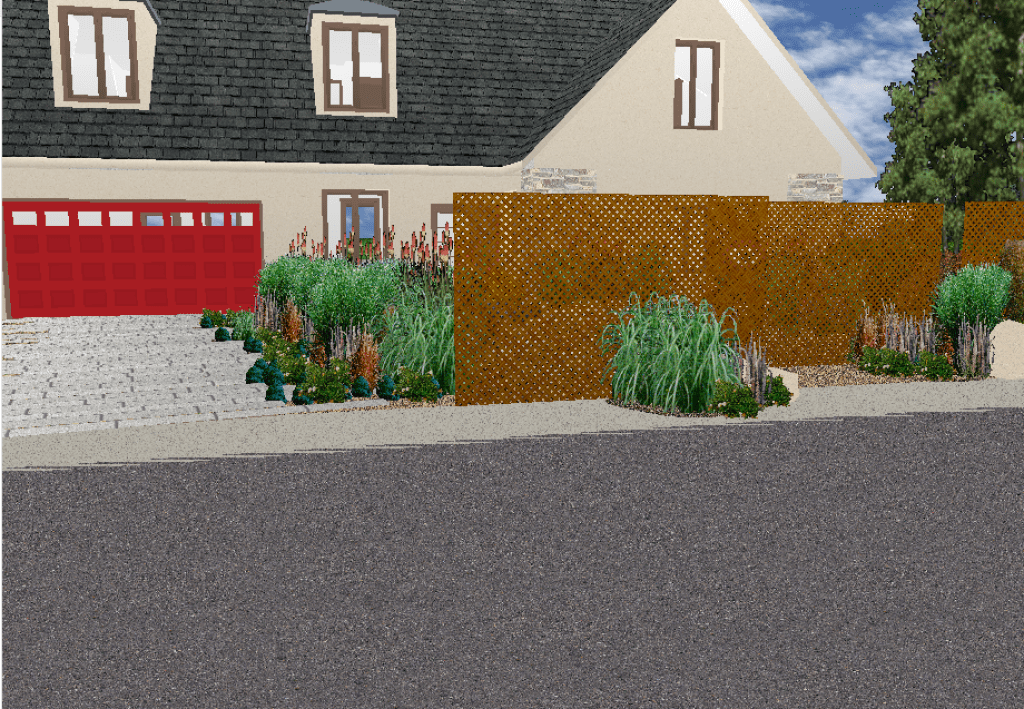A minimalist two-tier patio around a firepit with a well-lit garden office