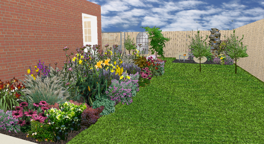 A log cabin, apple trees and big patio make this a lovely space for the whole family